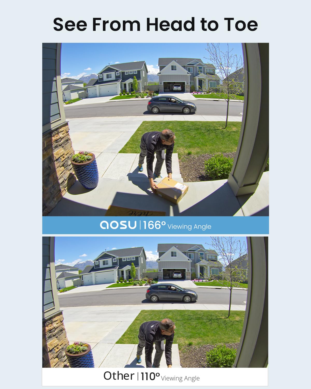 - 166° Field of View: You could see a person from head to toe or a package on the ground, there are no blind spots.