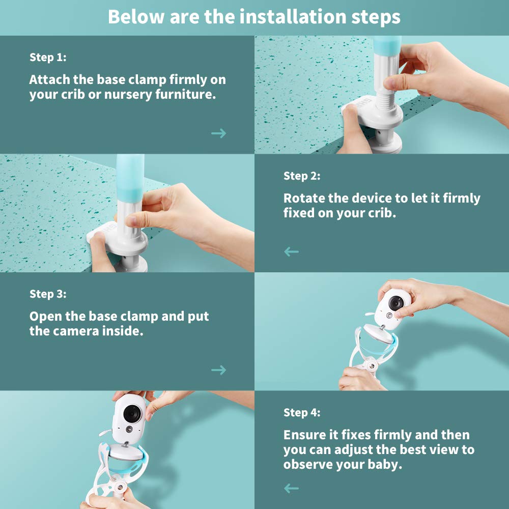 - No Sticking and No Drilling: this baby camera mount has a strong clamp that holds securely to most surfaces of furniture; The baby video camera is firmly affixed within the clamp and supported by a rubber silicone strip
