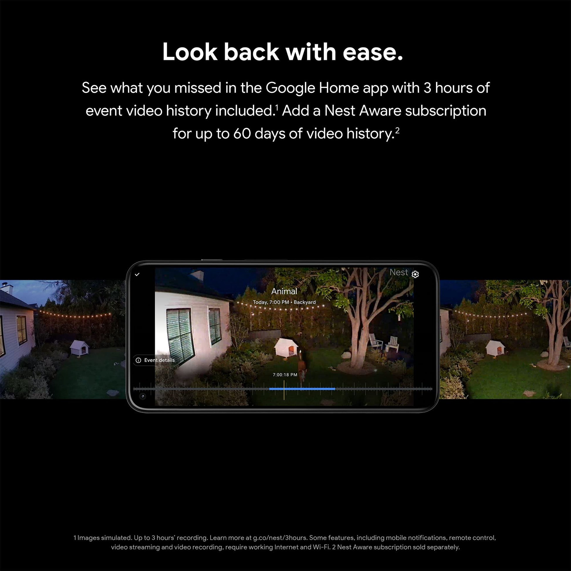 - Look back with ease; See what you missed in the Google Home app with 3 hours of event video history included; Add a Nest Aware subscription for up to 60 days of video history